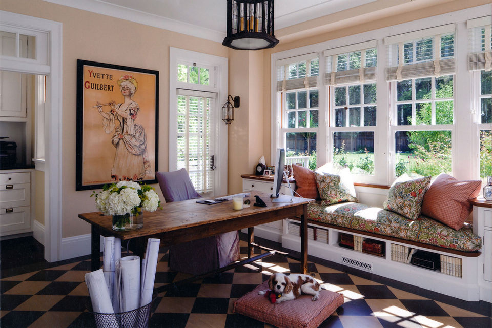 A window-seat sits above storage offering garden views. The diagonal floor tiling, antique table and bright fabrics make this an intimate utilitarian space.